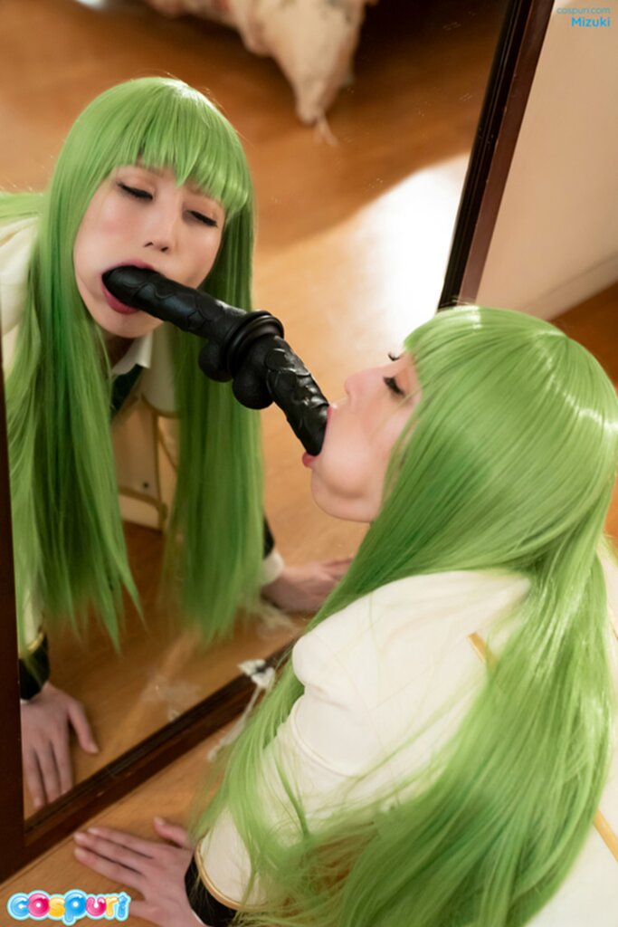Mizuki sucking black dildo looking in mirror